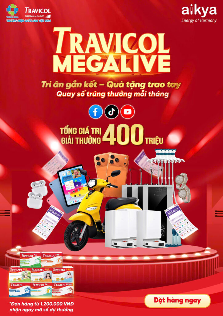 With just a Travicol order of 1,200,000 VND, your Pharmacy will immediately receive a lucky draw code, livestream directly on the Fanpage system – YouTube – TikTok Aikya.